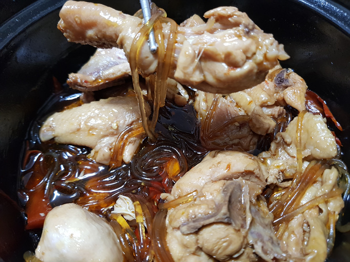 많이 졸였는데 닭 겉면에는 색이 입혀지지 않았지만 잘 익었고 간도 잘 배어 있었습니다.