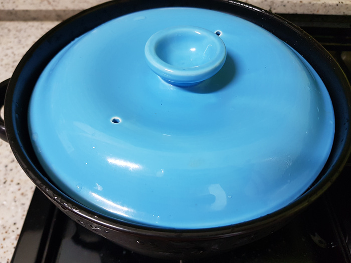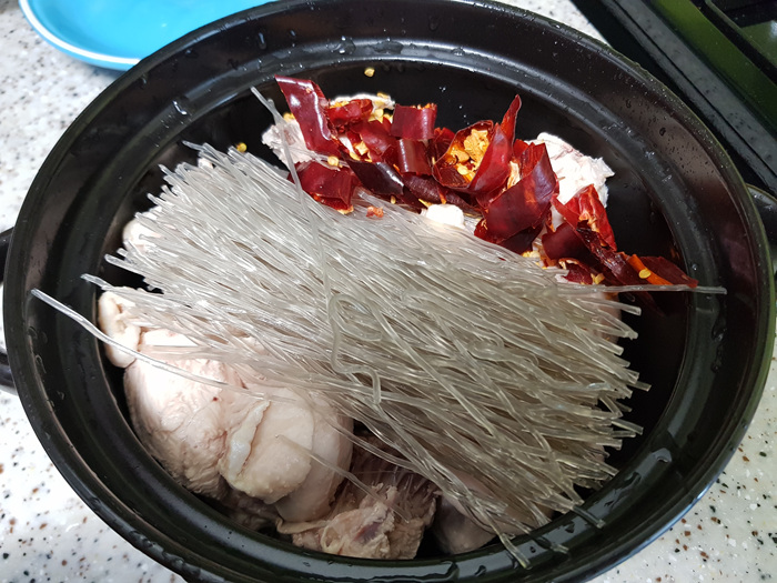 그리고 준비된 당면과 고추 그리고 소스를 넣어 뚜껑을 닫고 한 번 끓여줬습니다.