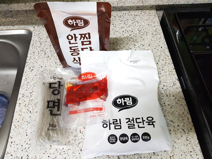 밀키트 내용물을 자세히 보니 닭고기, 당면, 마른고추, 소스가 들어 있었습니다. 채소는 집에 있는 것으로 준비해 같이 넣으면 되겠더군요.