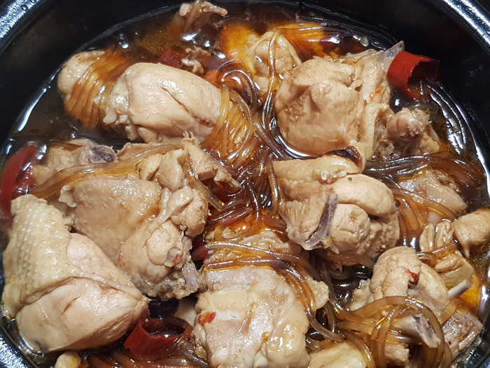 그리고 준비된 당면과 고추 그리고 소스를 넣어 뚜껑을 닫고 한 번 끓여줬습니다.