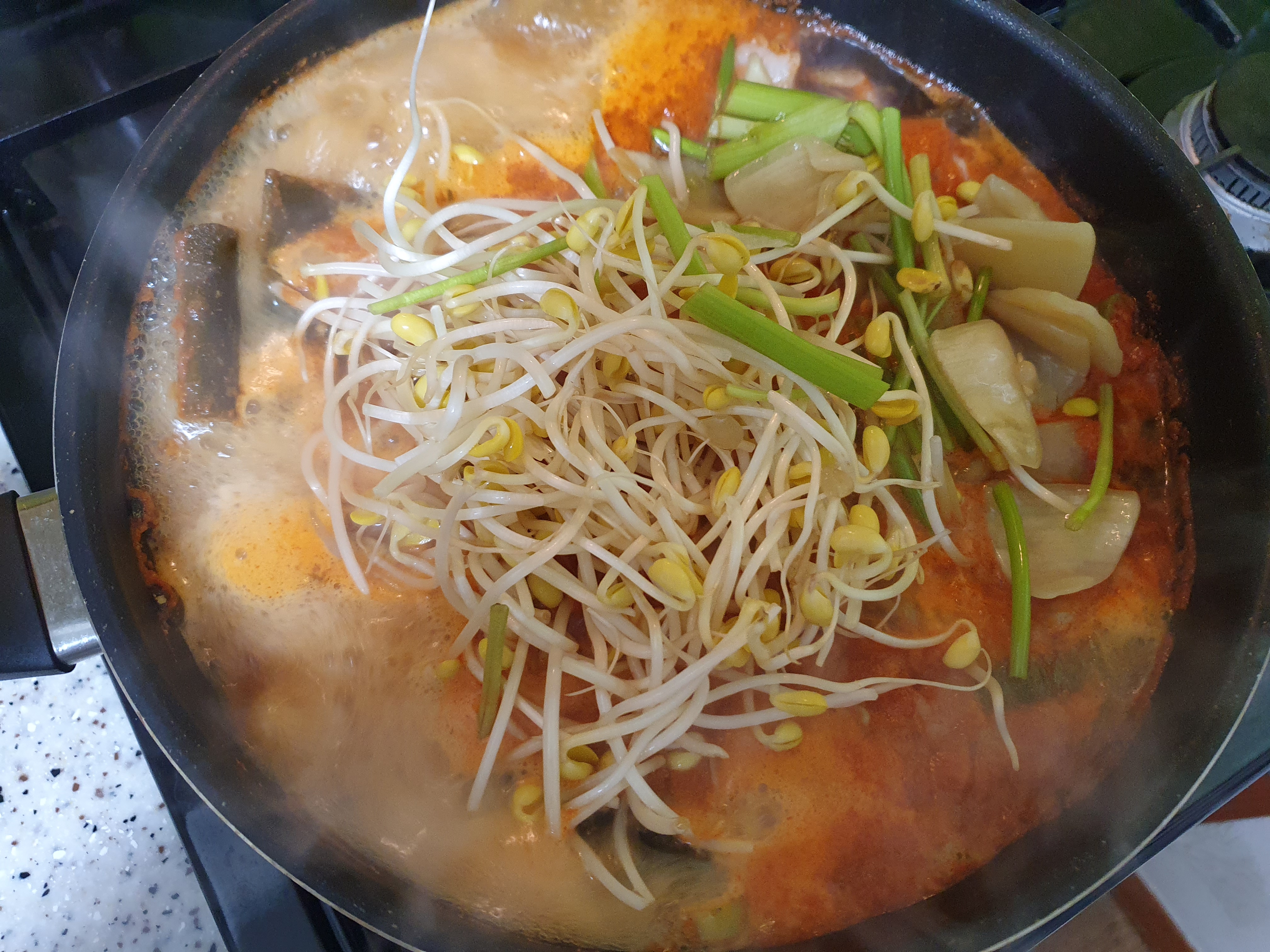 팔팔 끓기 시작하면 콩나물과 미나리, 수제비를 넣고 한소쿰 더 끓여 줍니다.