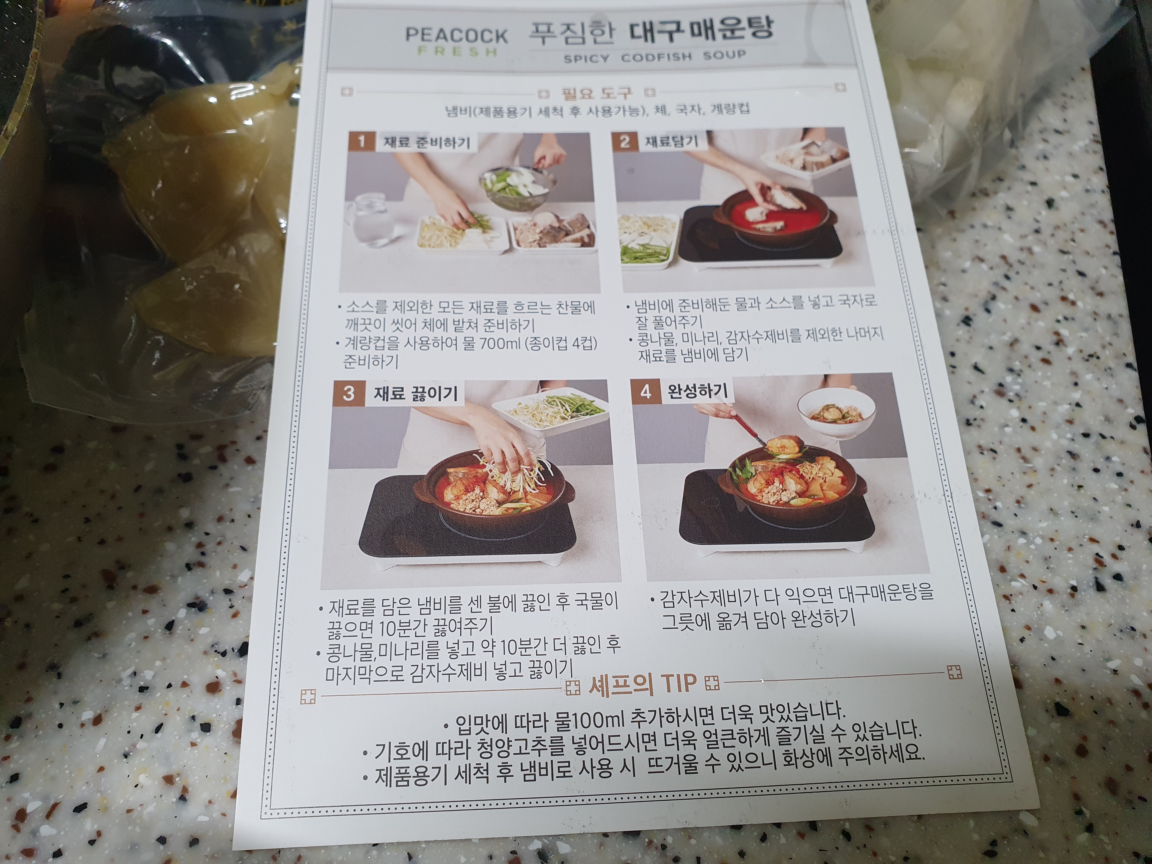 대구매운탕 재료는 신선한 대구와 채소 그리고 양념소스가 들어 있습니다. 재료들은 물에 깨끗이 헹궈 사용하시면 됩니다.