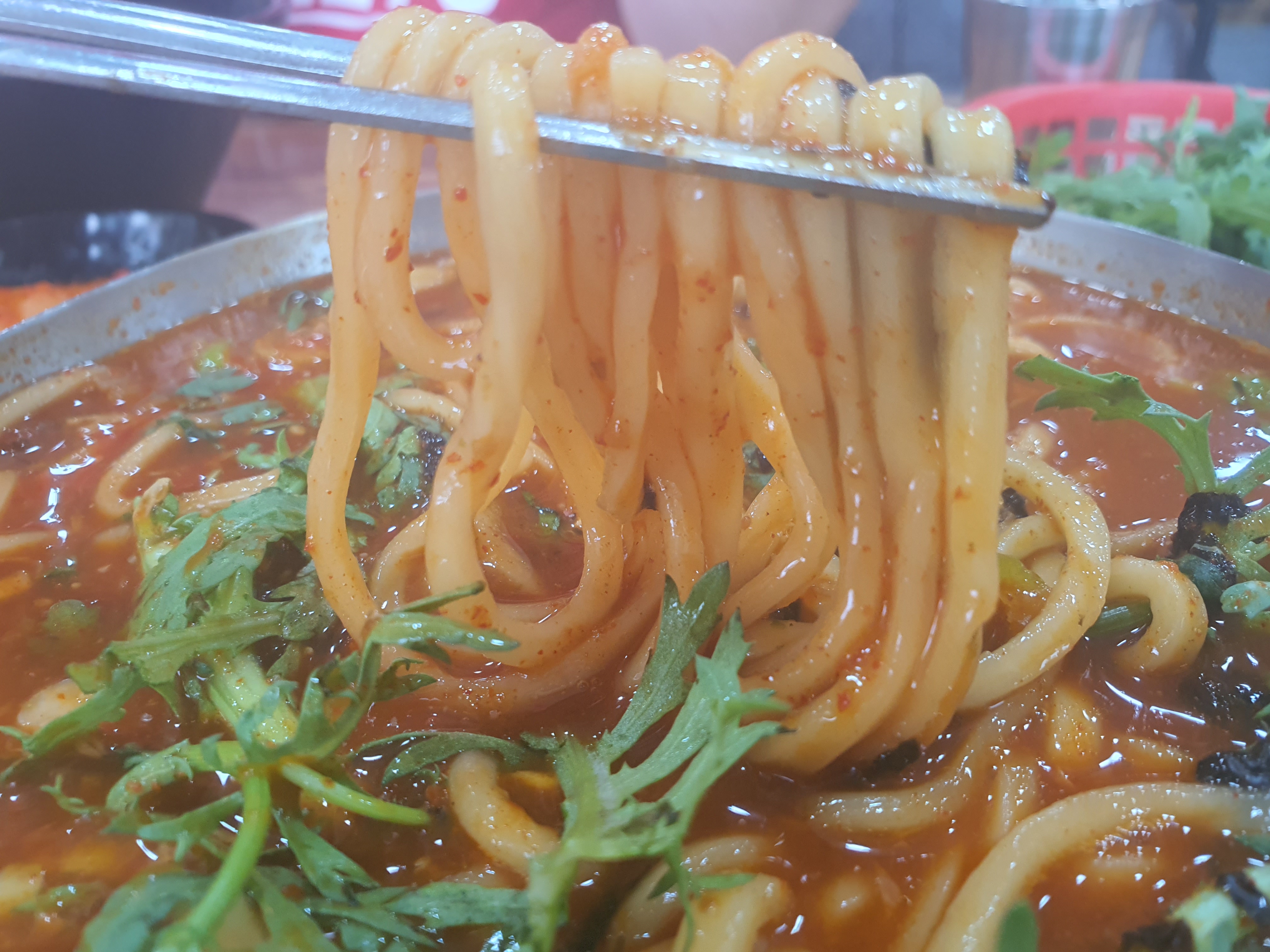 얼큰이 칼국수가 이내 나왔는데요. 1인 분 양 치고는 제법 푸짐했습니다. 혼자 다 먹기는 부담스러울 정도였어요. 그나마 짜장밥 하나 칼국수 하나 주문해서 다행이라는 생각이 들었네요.