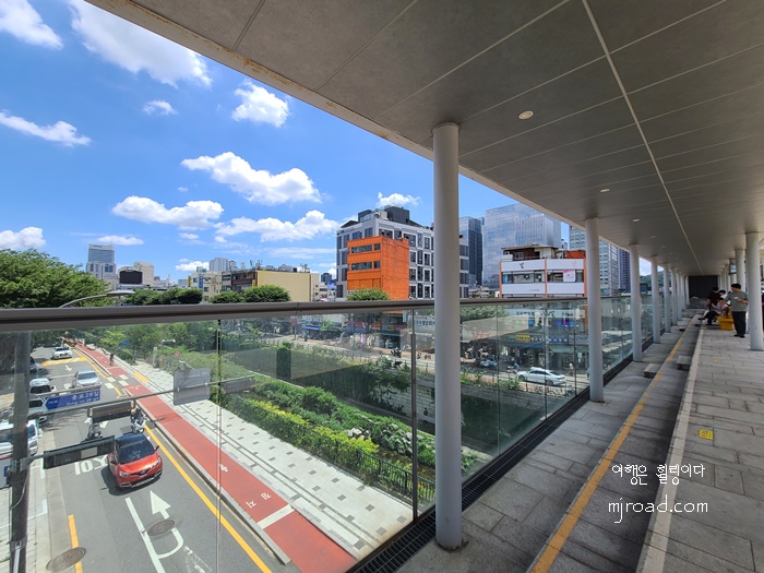 공중 보행길 곳곳에 설치된 잠시 쉬어가는 벤치엔 사람들이 앉아 쉬고 있고 있었고 잠시 멍 때리며 소소한 휠링을 하고 있었다. 바쁘고 쉼 없이 달려온 직장인들에겐 이 보다 좋은 휴식은 없지 않을까 싶다.