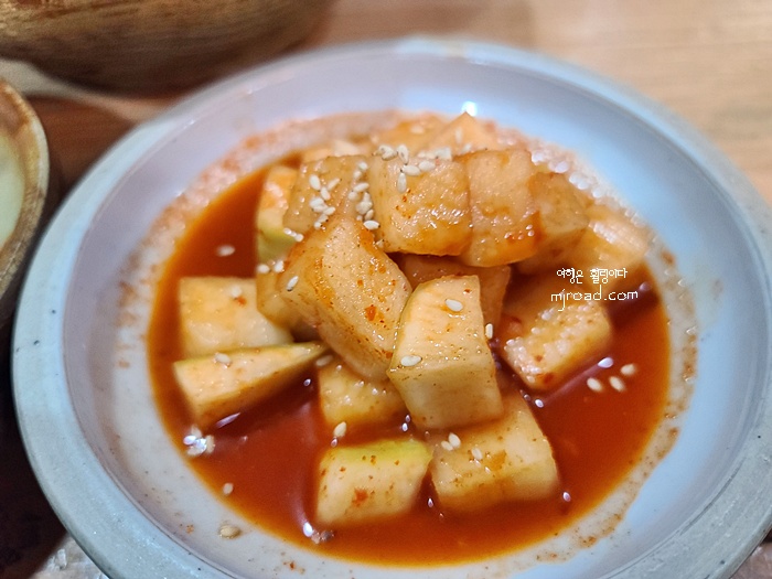 반찬은 늘 변함이 없이 깍두기와 양념이 가미된 고추지다. 맛은 있다.