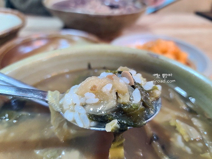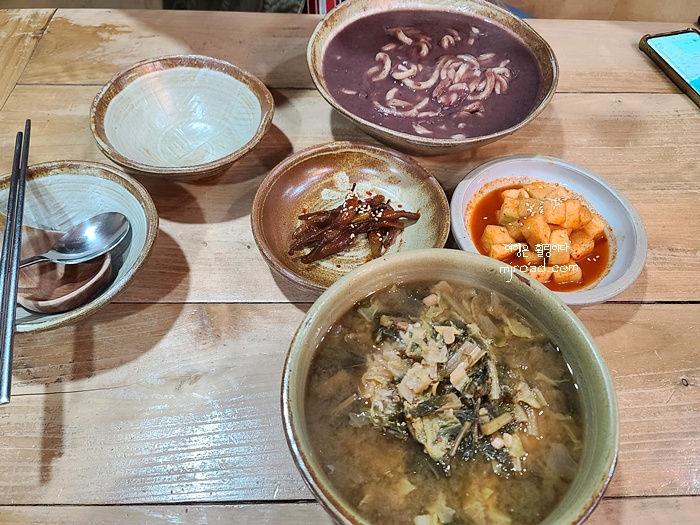 우린 팥칼국수 하나랑 시락국밥 하나를 주문했다. 시락국밥은 6,000원이다. 그냥 시락국에 밥을 말아 나오는 정도다. 손님들이 많지도 않았는데 팥칼국수에 들어간 팥이 뭉터기로 있었다. 주인장이 바뀐걸까? 왜 이러지? 하는 생각이 들었지만 된장을 뭉터기로 들어 있는 것이 아니니 그냥 잘 으깨어서 먹었다.