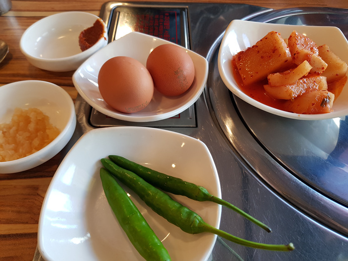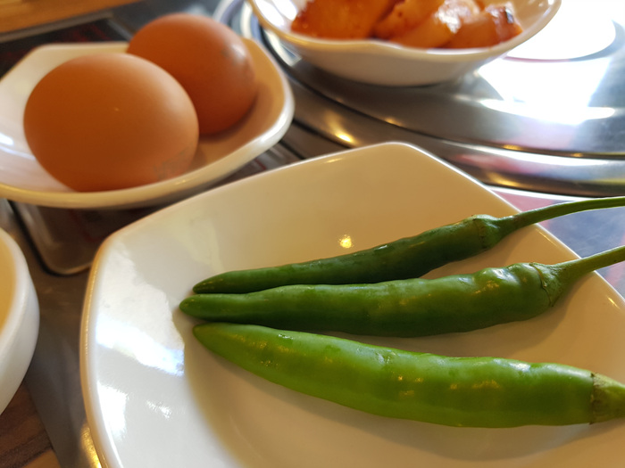 해장국을 주문하면 여느 해장국집과 마찬가지로 무김치와 청양고추 그리고 날달걀이 나옵니다.