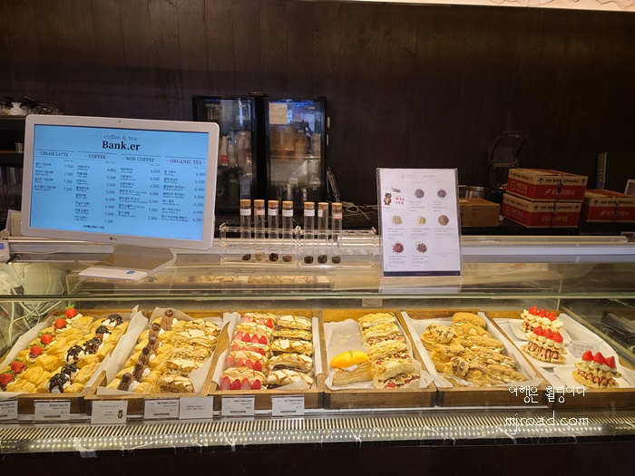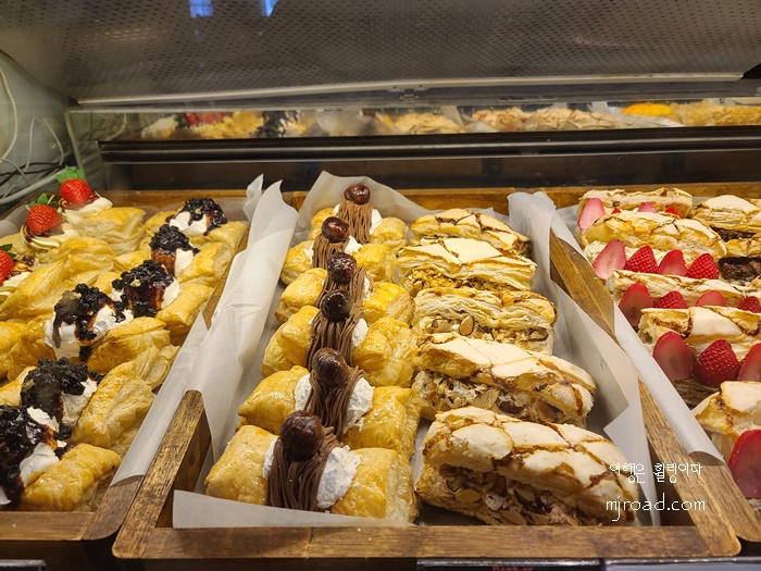 디저트가 이렇게 다양할 수 있냐는 생각이 들 정도로 눈이 즐겁고 입이 즐거운 그런 카페였다. 내부는어두컴컴한 느낌이었고 자연광을 위주로 즐기는 그런 내부여서 창가 자리에 손님이 많이 몰릴 듯 했다.