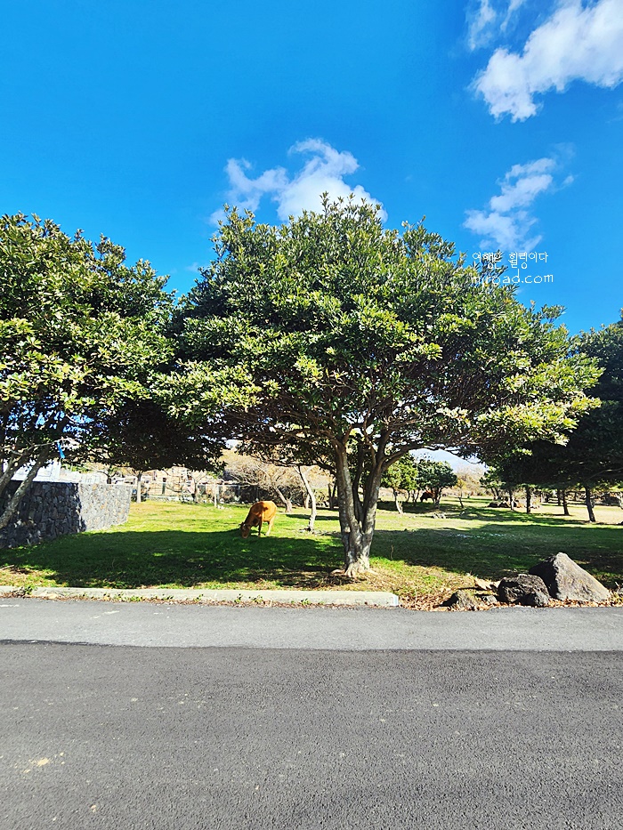 특히 자유롭게 풀을 뜯는 모습도 재밌는데 차들이 바로 옆에서 주차를 해도 별 신경을 쓰지 않는다는 것이 사람과 공존하면서 별 무서움 없이 자라고 있구나! 하는 생각도 들었다. 드라이브를 하다 만난 소의 여유로운 모습에 역시 제주도는 어딜가나 휠링 포인트가 곳곳에 숨어 있구나! 하는 생각이 들기고 한다.