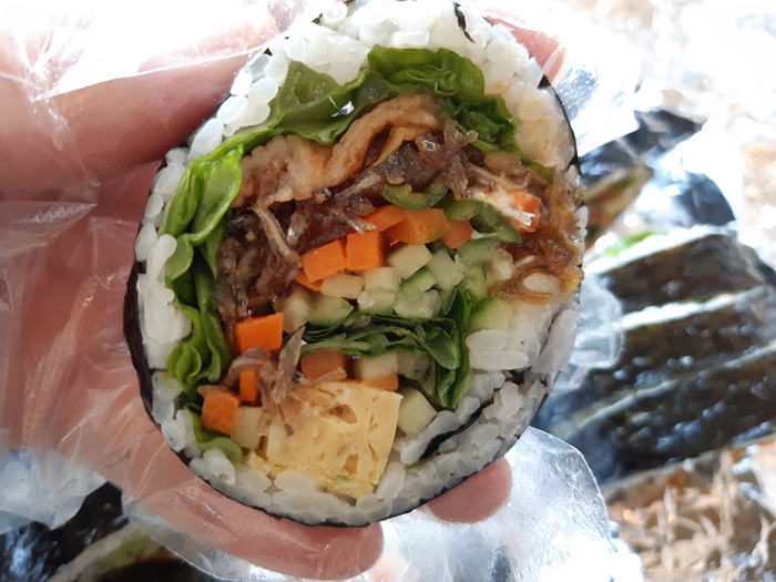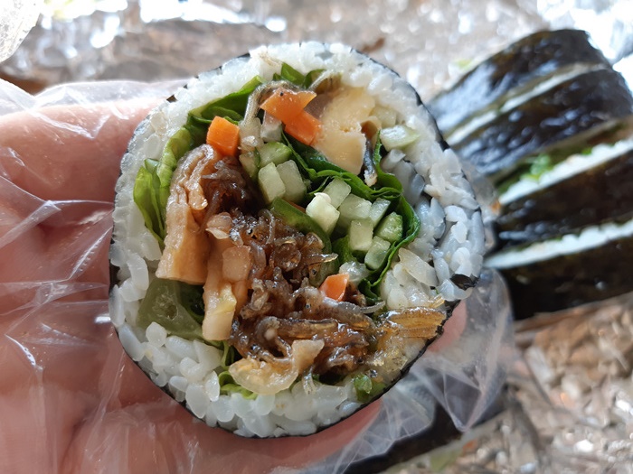 하여간 김밥속 내용물이 정말 푸짐합니다. 그래서 사람들이 매운멸치김밥을 외쳤군요~