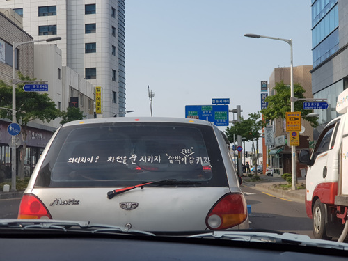 코로나19의 장기화로 인해 코로나블루가 생길 정도입니다. 그렇다 보니 별로 웃을 일도 없는 것 같고 사람들과의 소통도 많이 힘들어진 요즘이네요. 퇴근길..... 밀린 도로가에서 본 자동차의 문구에 한 번 더 생각하고 웃는 그런 날이었네요. 소소하지만 미소가 지어진 그런 문구.... 직접 적었다는 것에 더 재미나서 사진 한 장 올려 봅니다.