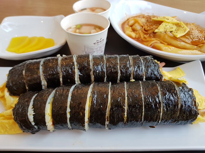 이른 아침에 가서 그런지 생각보다 많은 사람들이 없어 우린 앉아서 먹고 가기로 했습니다. 일반김밥과 멸치김밥 그리고 떡볶이를 주문했는데 10,000원 정도로 저렴하더라고요.
