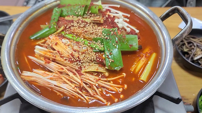 잠깐 이곳저곳 구경하다보니 우리가 주문한 순살갈치조림이 나왔다. 2인 분 치고는 양이 꽤 많아 보였다. 무엇보다도 맛있어 보인다는 생각이 비주얼에서도 들어났다. 가스렌지에 올려진 조림은 한소쿰 더 끓여줘야 한단다. 배가 무척 고팠기에 기다리는 시간도 어찌나 길게 느껴지던지 ...
