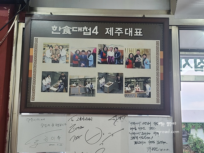 역시나 이곳도 넓은 내부 만큼이나 손님에 있느 곳은 몇 테이블 없었다. 제주도가 일찍 저녁장사를 접는 이유도 있겠다라는 생각이 조금은 들기도 했다. 문 입구 주변에 앉았는데 유독 눈에 띄는 내용이 붙어 있었다. 한식대첩 제주대표로 나갔나보다. 주변엔 유명 연예인 싸인도 붙어 있었다.