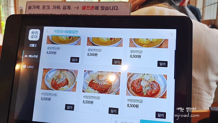 가격은 보통이나 곱배기나 같다. 착한가격의 8,500원이다. 테이블마다 오더와 계산을 바로 할 수 있어 편하다. 메뉴를 주문 후에는 반찬이 나온다. 반찬이라고 해봐야 무김치지만 사실 이것만 해도 충분하다고 느낄 정도이다. 반찬리필은 종업원에게 말하면 되고 물이나 육수는 셀프로 갖다 먹어야 한다.