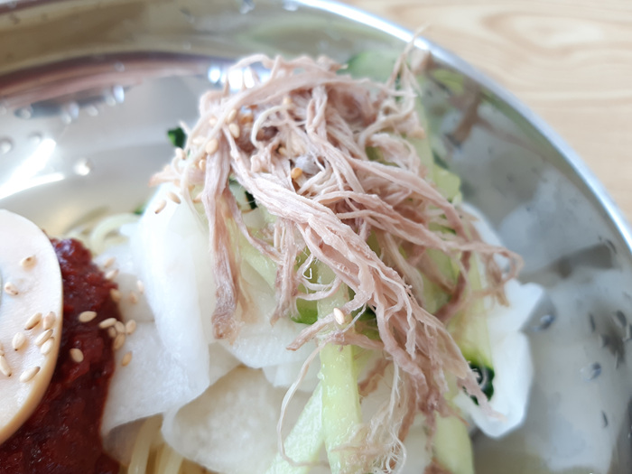 하귀밀면은 닭고기를 이렇게 고명으로 올려 줍니다.