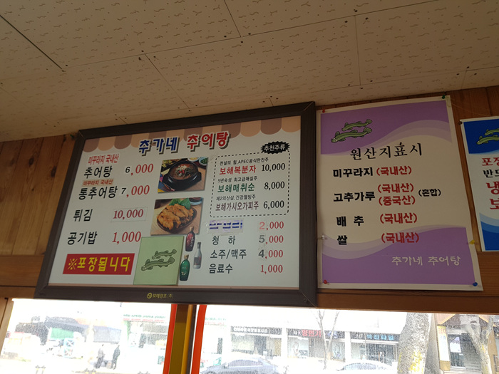 일반 미꾸라지를 갈아서 끓여 나오는 것은 6,000원이고 통추어탕은 7,000원입니다. 정말 저렴합니다. 거기다 미꾸라지는 국내산이고요. 배추, 쌀도 국내산을 사용하고 있습니다.