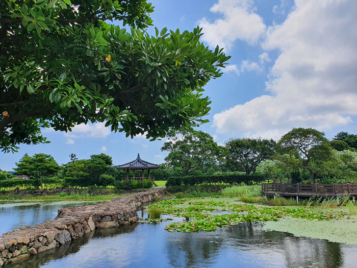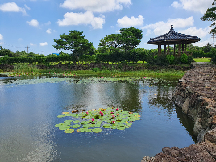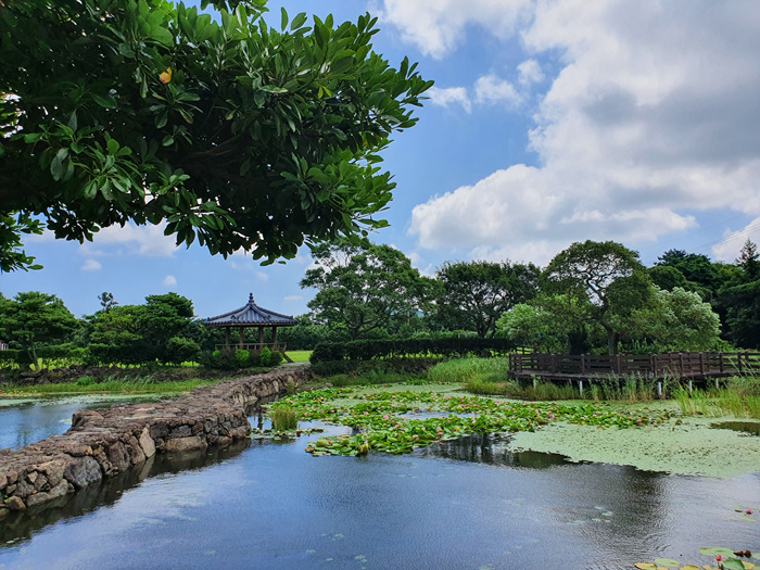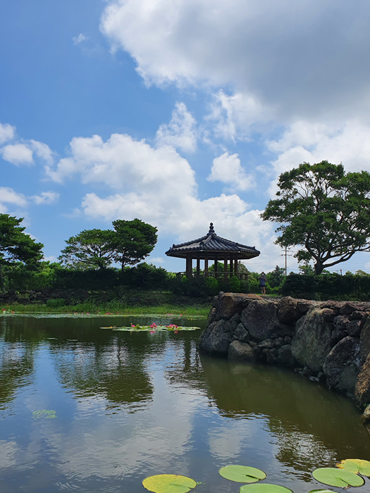 ' 여기 제주도야! ' 라고 말하지 않으면 절대 제주도인지 잘 모를 그런 풍경이 펼쳐졌습니다. 이런 풍경을 보는데 차를 멈추지 않으면 안되겠죠. 연못 중앙에 연결된 돌다리와 정자 그리고 연꽃들이 정말 아름답게 어우러져 있더군요.