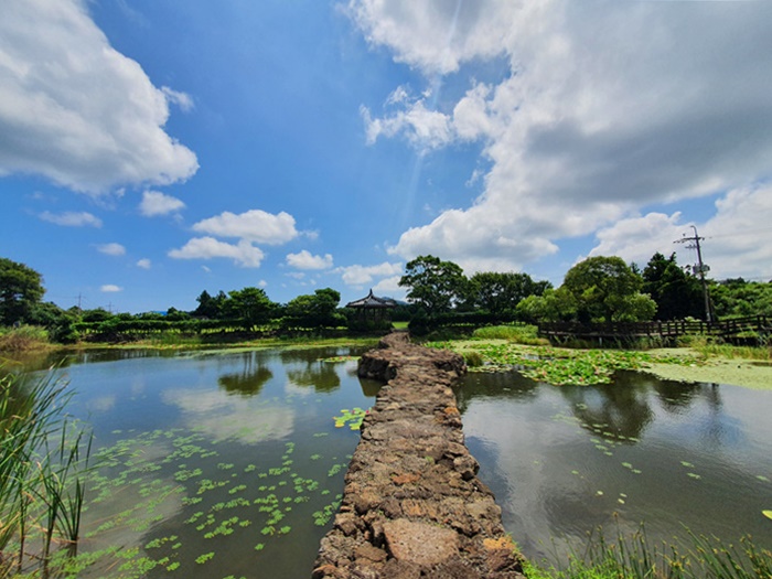 제주도는 천혜의 자연환경으로 되어 있는 섬이다 보니 어딜가나 아름다운 곳이 많습니다. 하지만 유명한 곳이면 어김없이 많은 사람들로 북적이기 마련이죠. 그렇다고 사람없는 곳을 다니기도 좀 그렇고... 오늘은 여행 중 정말 우연히 발견한 한 장소를 소개할까합니다. 제주도에서 유명한 비자림으로 향하던 길이었지요. 지나가는 길에 어찌나 연못이 아름다운지 마치 육지에서 보던 그런 고즈넉한 풍경을 마주했답니다.