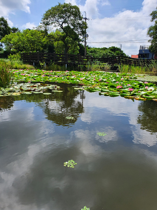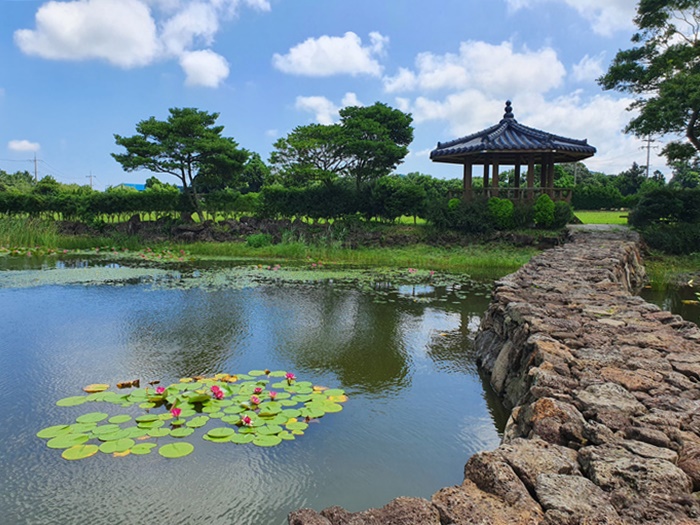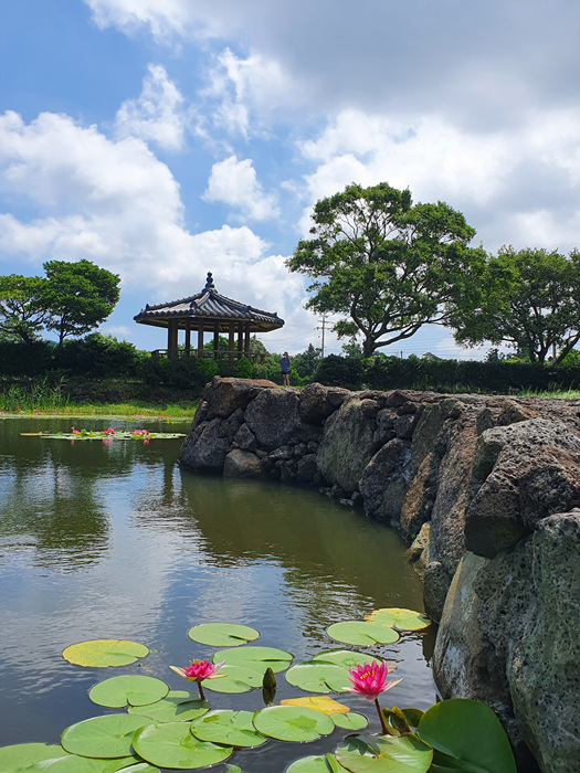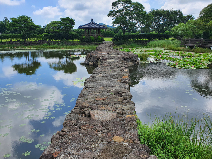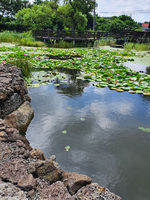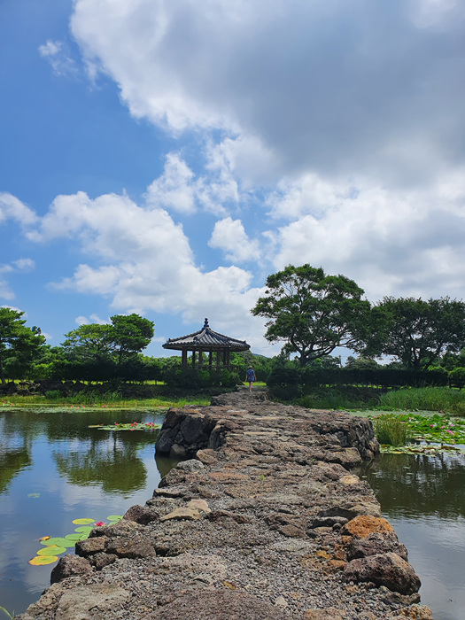 ' 여기 제주도야! ' 라고 말하지 않으면 절대 제주도인지 잘 모를 그런 풍경이 펼쳐졌습니다. 이런 풍경을 보는데 차를 멈추지 않으면 안되겠죠. 연못 중앙에 연결된 돌다리와 정자 그리고 연꽃들이 정말 아름답게 어우러져 있더군요.