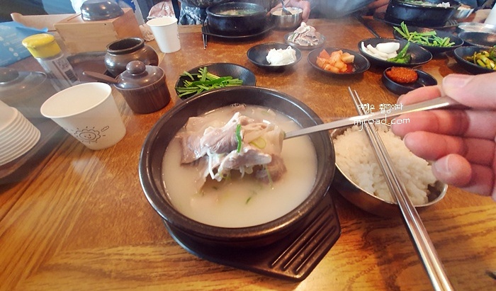 이곳은 제주도민들이 주로 가는 맛집이다. 한마디로 로컬맛집이라고 해야 맞을 듯하다. 남원읍에 위치해 있는 이곳은 제대로 된 뼈해장국, 돼지국밥등이 유명한데 난 눈에 띄는 돼지국밥을 먹기로 했다. 해장국이야 평소 자주 먹었던 음식이라 다 그려려니 해서 말이다. 돼지국밥을 주문하면 부추와 깍두기 그리고 소면, 고추, 양파 ,쌈장이 나온다.