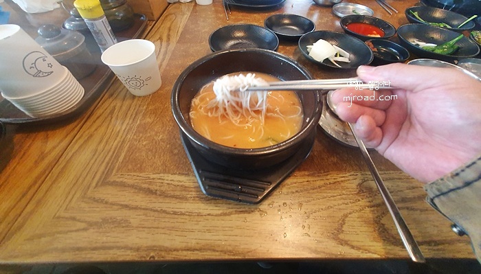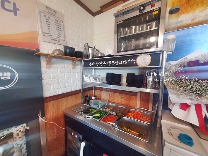 돼지국밥에 소면을 넣어 먹으면 그 맛도 일품이고 뭔가 허전함을 채워주기에 딱이다. 반찬이나 소면은 셀프코너에서 리필해 먹을 수 있으니 소면 좋아한다면 셀프로 갖다 먹으면 된다.