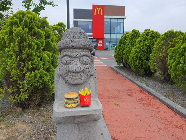 햄버거를 먹고 나서 일부러 사진 한 장 찍기 위해 걸어 나왔네요. 요거요거 정말 귀엽죠. 진짜 같은 모형 햄버거를 들고 있는 하르방입니다. 제주도라서 더 귀엽게 느껴지는 것 같아요. 차를 타고 지나갈때마다 눈에 띄었는데 오늘은 일부러 사진 찍기 위해 걸어서 나왔답니다.