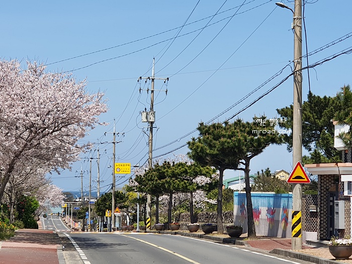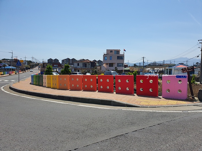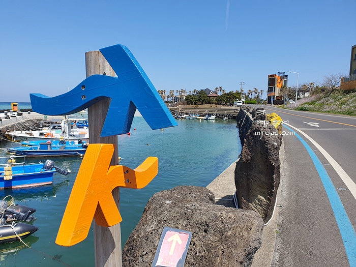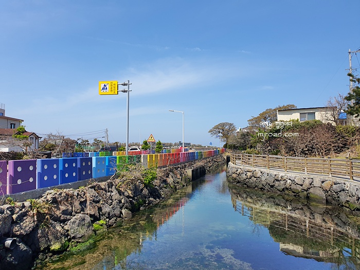신흥리 해변을 따라 걷다보면 주변에는 민박집도 있고 핫플레이스로 사랑 받고 있는 무지개 도로도 있다. 제주도 공항 주변에 있는 도두 해안도로 무지개 도로와는 사뭇 다른 풍경으로 다가오긴 하지만 그래도 사진으로 남기면 거의 비슷한 모습으로 연출되어 많은사람들에게 사랑 받는 핫 포토스팟이다.