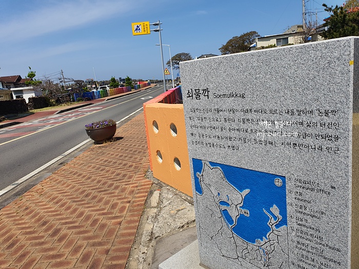 신흥리 해변을 따라 걷다보면 주변에는 민박집도 있고 핫플레이스로 사랑 받고 있는 무지개 도로도 있다. 제주도 공항 주변에 있는 도두 해안도로 무지개 도로와는 사뭇 다른 풍경으로 다가오긴 하지만 그래도 사진으로 남기면 거의 비슷한 모습으로 연출되어 많은사람들에게 사랑 받는 핫 포토스팟이다.