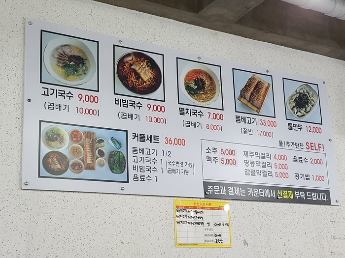 국수값은 가격이 다 올랐습니다. 대부분 손님들은 고기국수와 비빔국수를 섞어서 주문하는데 저흰 비빔국수 2개 주문했어요. 가격은 9,000원입니다. 굳이 곱배기를 주문하지 않아도 양이 푸짐하게 나오니 보통으로 주문하시면 되세요.