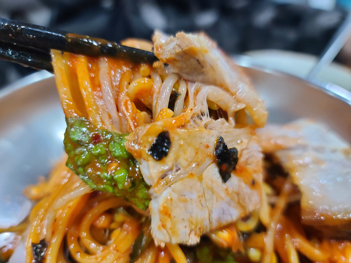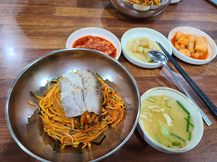 비빔국수를 주문하면 수육도 몇 점 고명으로 올라갑니다. 그리고 멸치국물도 같이 나오니 먹기엔 부담없어요. 손님이 별로 없어서 그런지 생각보다 빨리 나왔습니다.