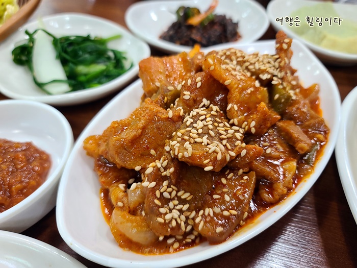 고등어는 염지를 잘 해서 완전 입에서 살살 녹아요. 기름기 쫙 뺀 고등어구이 그냥 밥이랑만 먹어도 한 그릇 뚝딱하게 만듭니다. 같이 나오는 제육볶음은 비계가 생각보다 많아 조금 니글거리긴 했지만 워낙 다른 반찬이 많이 나와 부족하다는 생각은 하지 못했어요.