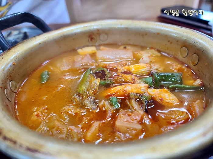 한 냄비 가득 나오는 김치찌개도 칼칼하니 맛있어요. 참고로 1인이 가도 식사가 가능하니 부담없이 가셔도 될 듯 합니다. 요즘엔 혼자 여행하는 분들이 많이 늘다 보니 그런 점도 참고해 장사를 하시더라고요.