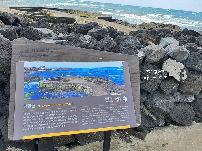 천혜의 자연환경을 지닌 제주도는 어딜가나 환상의 풍경을 보여 준다. 이번에 간 곳도 그랬다. 김녕 지오트레일에 선정된 청굴물은 물이 들어오는 날이면 멋진 바다 풍경을 볼 수 있다. 내가 간 날은 물이 그렇게 많진 않았지만 그래도 그만의 매력은 충분히 있었던 것 같다.