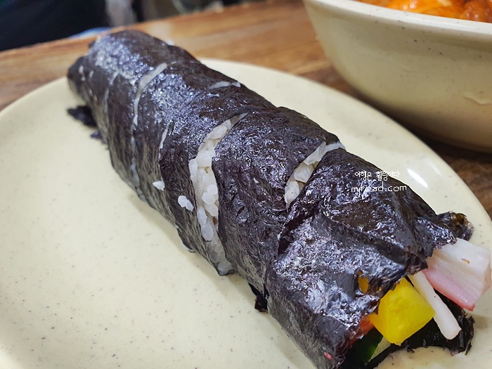 김밥은 가격 그대로의 내용물이다. 안에 들어가는 재료는 튀기거나 굽거나 하지 않고 원재료를 그냥 썰어 넣었다. 이런 김밥은 처음이라 솔직히 놀람...