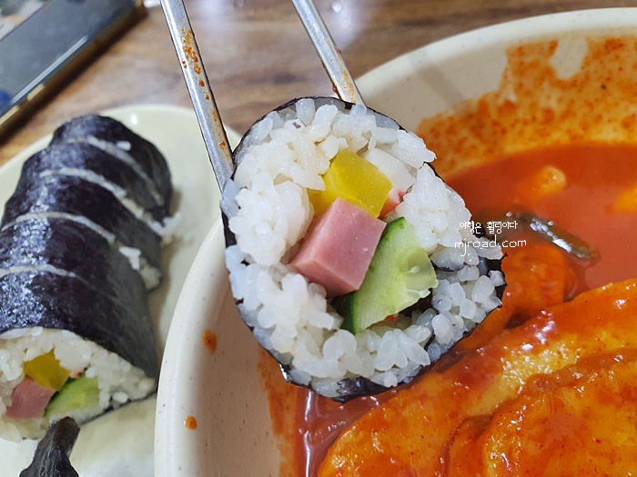 김밥은 가격 그대로의 내용물이다. 안에 들어가는 재료는 튀기거나 굽거나 하지 않고 원재료를 그냥 썰어 넣었다. 이런 김밥은 처음이라 솔직히 놀람...