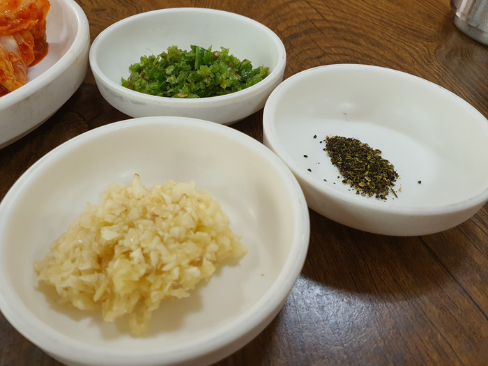 추어탕에 넣어 먹는 간마늘, 땡초간 것, 산초가루도 괜찮고 테이블에 놓여진 들깨가루도 꽤 향이 진하고 괜찮다. 반찬은 더 먹고 싶으면 셀프로 리필해 먹으면 된다.