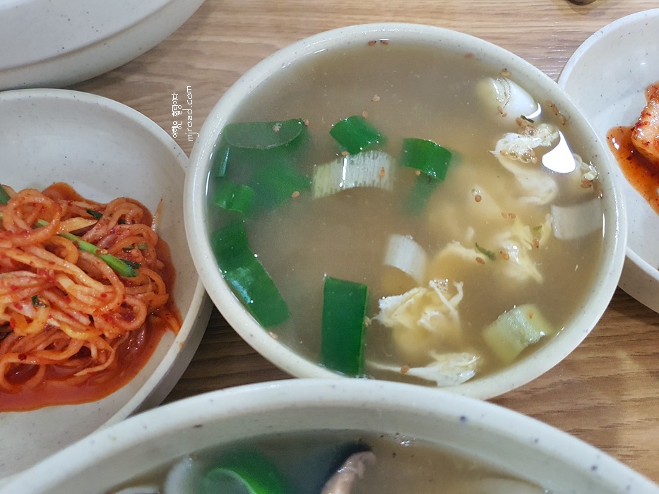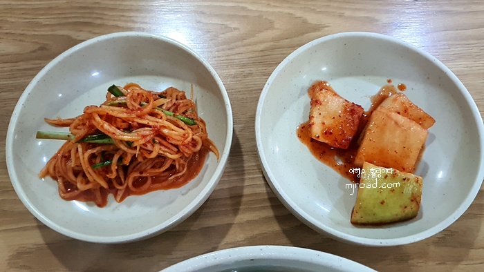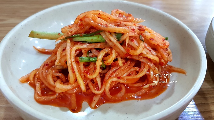 비빔밥과 함께 나오는 육수는 칼국수 국물이 나옵니다. 그리고 반찬은 두 가지가 나오는데요. 생채와 무김치가 나와요. 둘 다 입에 넣으면 감칠맛 장난이 아닙니다.
