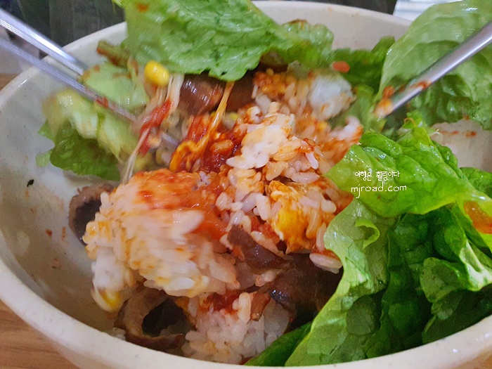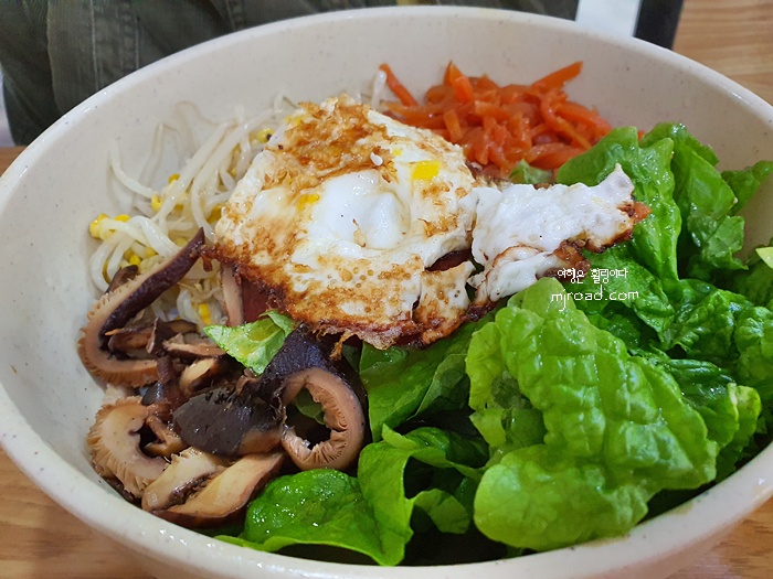 10년 전이나 지금이나 내용물은 거의 똑 같다고 해도 과언이 아닙니다. 그래서인지 가격이 올라도 제주도민들에게 사랑받는 곳이 아닐까싶네요. 비빔밥은 현재 7,000원입니다. 표고버섯, 콩나물, 당근, 상추, 달걀후라이가 올라 갑니다. 고추장도 들어가 있어요. 평소 간을 약하게 드시는 분들은 이곳 비빔밥 메뉴가 꽤 간이 세니 참고해 주세요.