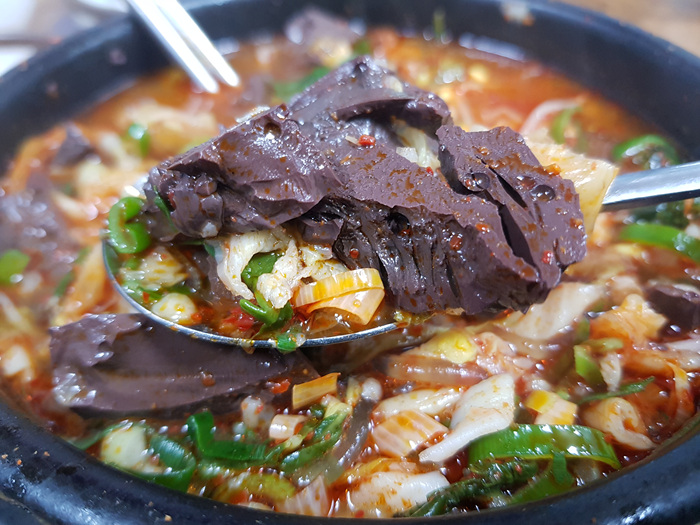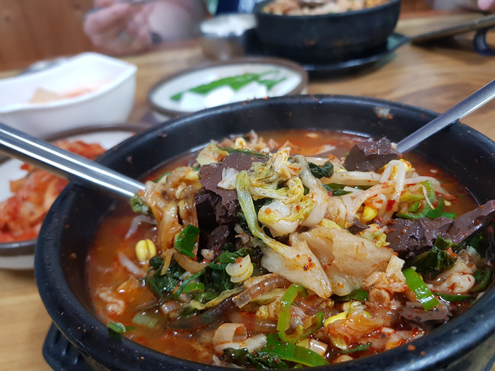 2명이 가면 제일 많이 먹는 선지가 들어간 해장국과 내장이 가득 들어 있는 내장탕을 주문했습니다. 뚝배기 가득 푸짐한 해장국..... 주인장의 정성도 살짝 엿보이는 부분이긴 합니다.
