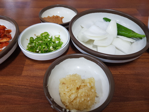 찬은 여느 해장국집과 비슷합니다. 김치, 깍두기, 양파, 고추 이렇게 나옵니다.