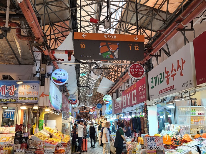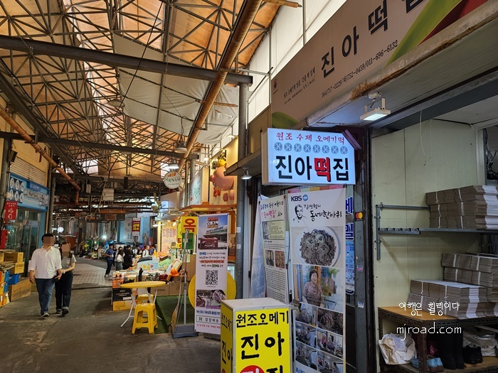 1층 주차장에 주차를 하고 약간의 계단을 내려가면 입구에 식당가가 있고 바로 옆은 떡집, 선물가게등 재래시장 곳곳을 구경할 수 있는 골목이 나온다. 경기가 안 좋아서 그런지 손님은 예전처럼 많지는 않았지만 동네 장사에 비하면 이곳은 그나마 관광객들이 찾아가는 식당가이다.