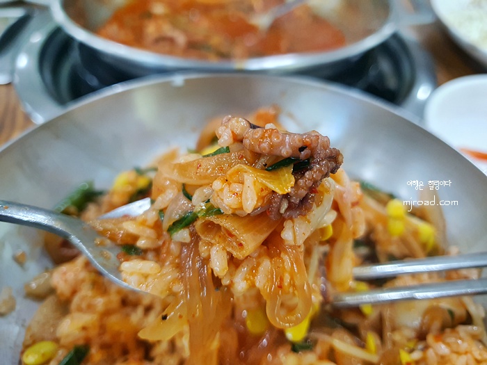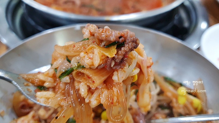 낙지볶음과 콩나물 무침을 같이 넣고 비벼 먹으면 밥도둑이 따로 없을 정도로 맛있다. 탱글탱글한 낙지의 맛은 어느 지역이나 비슷해서 조방낙지가 있는 간판이 있는 곳으로 들어가면 절대 실패는 없다.