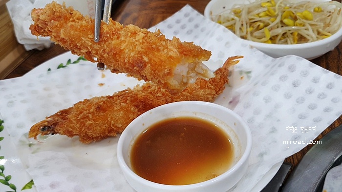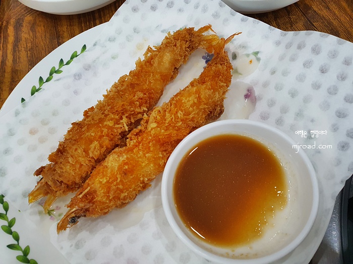 테이블 위에 놓여진 리뷰 안내이다. 영수증 리뷰를 하면 새우튀김이 나온다. 1인 1마리이긴 하지만 크기가 커서 맛있었다.