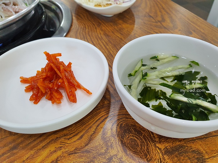 반찬도 정갈하니 잘 나왔다. 신선한 미나리, 깍두기, 달걀찜, 콩나물무침, 샐러드, 일미무침 그리고 매콤한 낙지볶음을 완화해 줄 미역냉국까지 이렇게 나온다. 먹다가 반찬이 모자라면 리필이 가능하다.