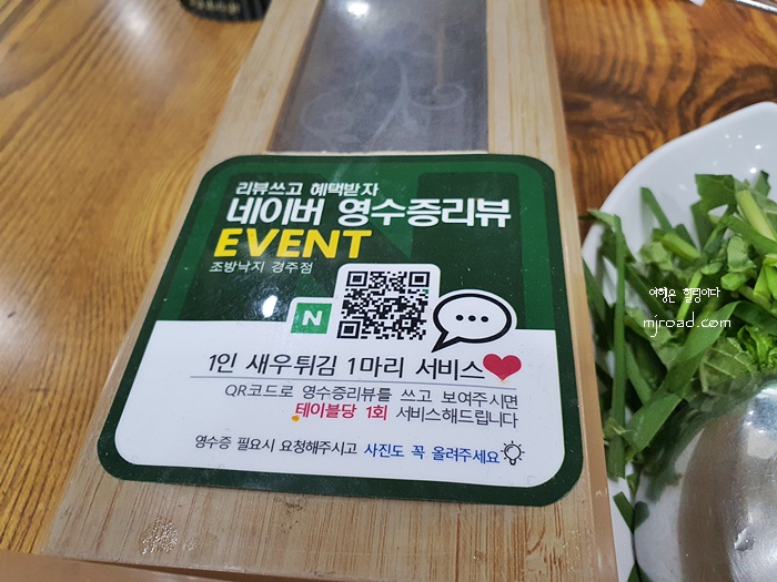 테이블 위에 놓여진 리뷰 안내이다. 영수증 리뷰를 하면 새우튀김이 나온다. 1인 1마리이긴 하지만 크기가 커서 맛있었다.