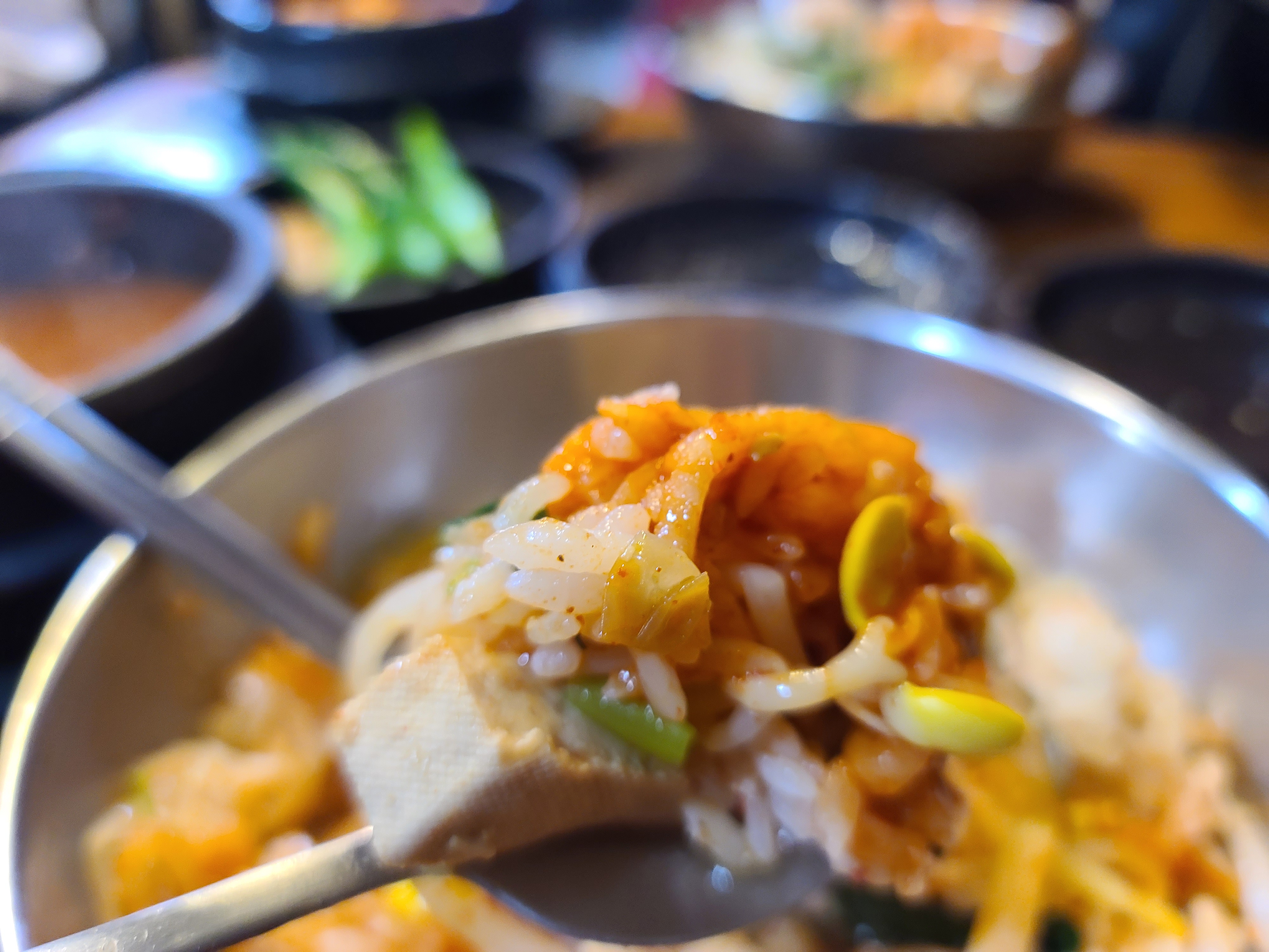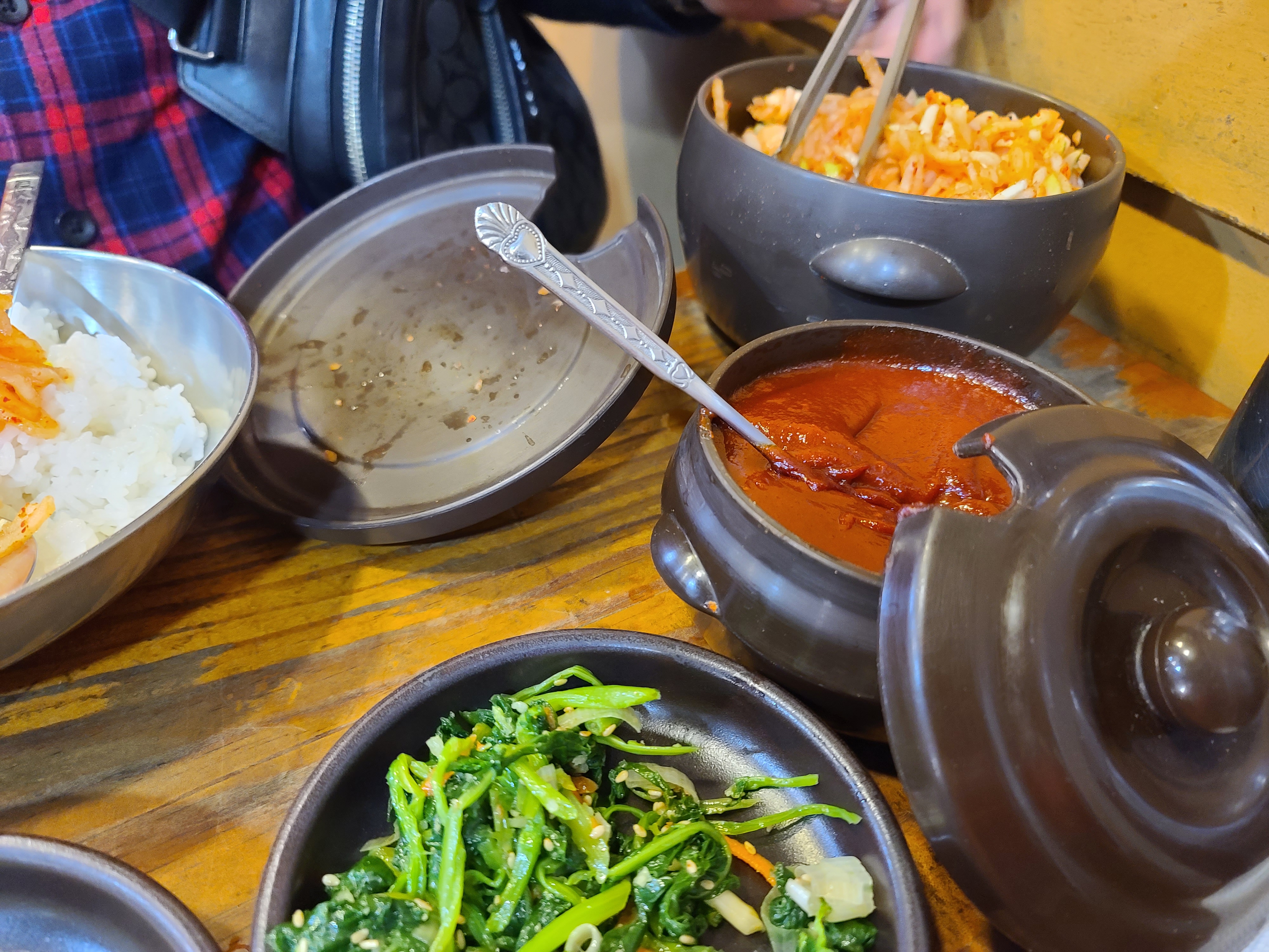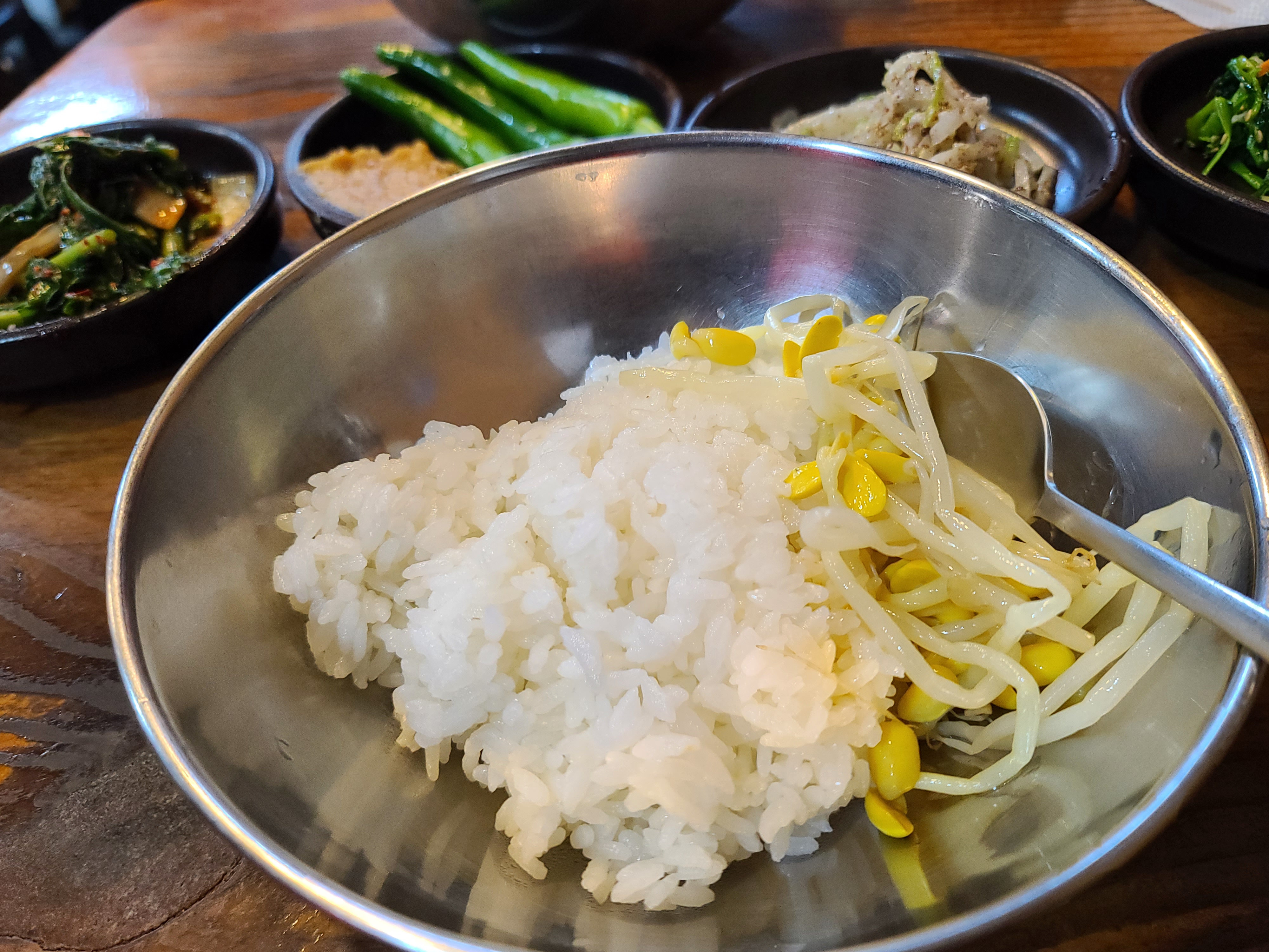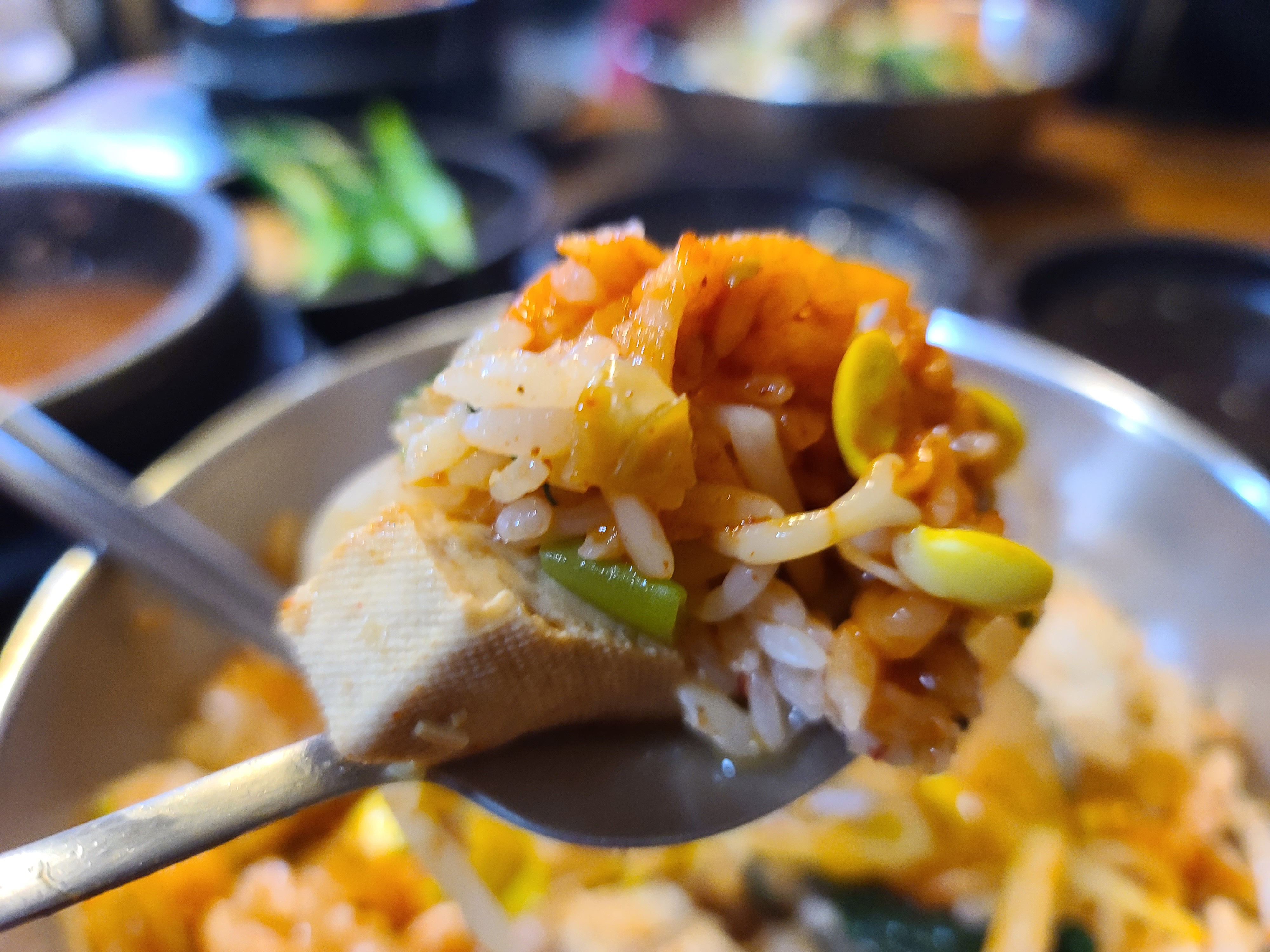 기본적인 나물 반찬 4가지가 먼저 테이블에 놓이고 넓은 대접에 밥이 나온다. 그냥 비빔밥으로 먹어도 맛있지만 순두부와 청국장이 뚝배기에 보글보글 끓여 나오기에 같이 비벼 먹으면 마파람에 게눈 감추듯 순식간에 해치우게 된다.