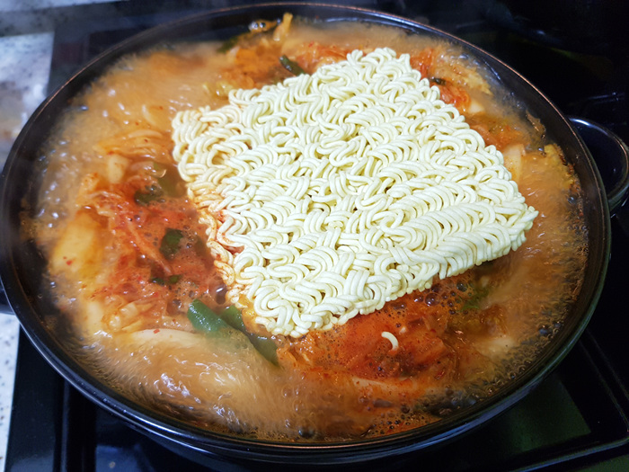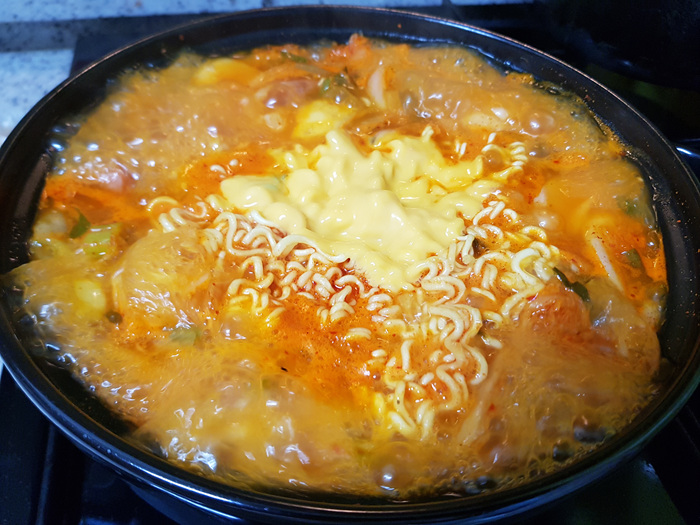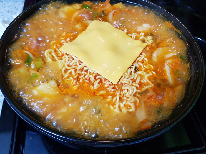 라면도 팔팔 끓어 다 익을 정도쯤 치즈 한 장을 넣습니다. 이렇게 끓인 후 불을 끄면 송탄식 부대찌개 완성!