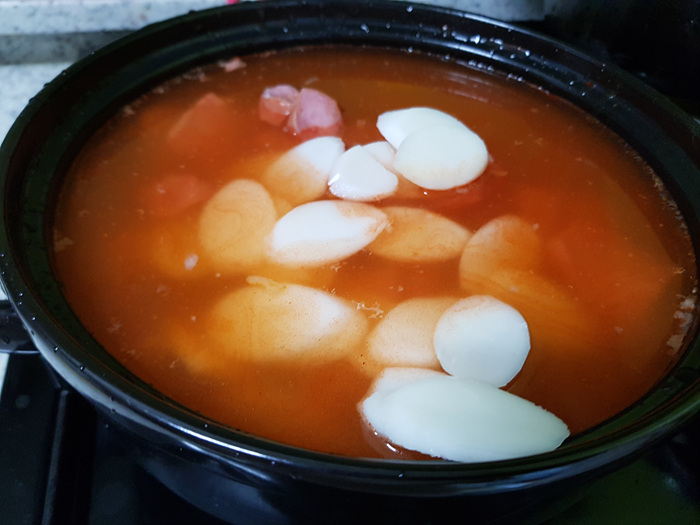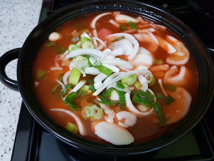 너무나도 간단해 그냥 막 끓인 듯 합니다. 물에 부대찌개 양념장을 넣고 잘 풀어 주세요.