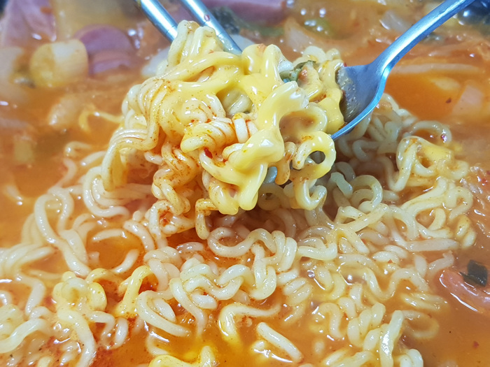 라면도 팔팔 끓어 다 익을 정도쯤 치즈 한 장을 넣습니다. 이렇게 끓인 후 불을 끄면 송탄식 부대찌개 완성!